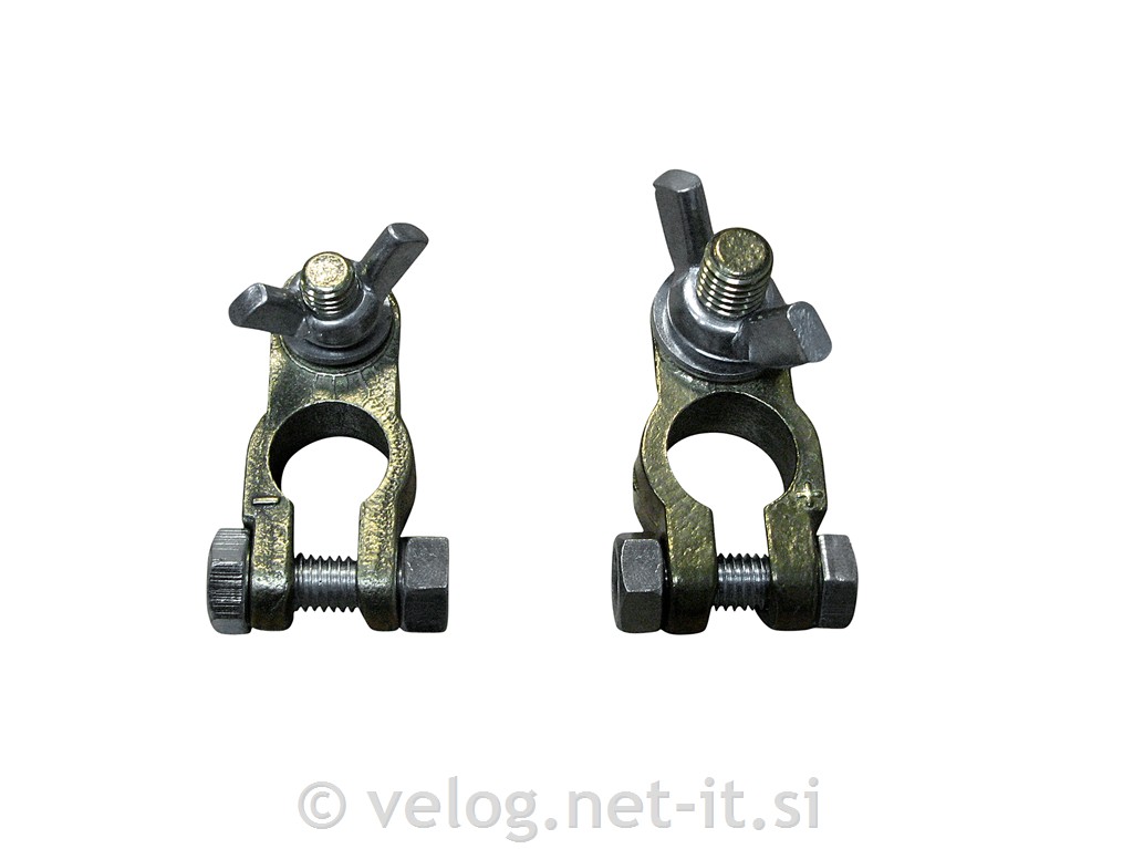Standardni akumulatorski poli (+ / -) (kleme) iz medenine, ki jih privijačimo na akumulator z M5 terminali. Omogočajo nam vezavo akumulatorjev z objemko in ne z vijaki.