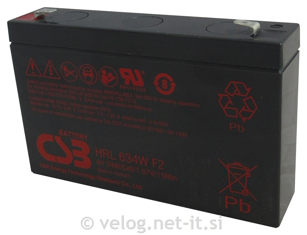 UPS akumulator 9Ah 6V F2 firme CSB Energy Technology (EMEA) B.V. je namenjen za sisteme neprekinjenega napajanja, kjer je zahtevana visoka učinkovitost akumulatorja, ko prihaja do velikih tokovnih obremenitev. Firma CSB Energy Technology (EMEA) B.V. je pomemben dobavitelj UPS baterij za prvo vgradnjo tudi za APC, ki je v sklopu Schneider Electric, kar potrjuje kvaliteto in zanesljivost. UPS baterija HRL634W ima pričakovano življenjsko dobo po EUROBAT 10-12 let.
