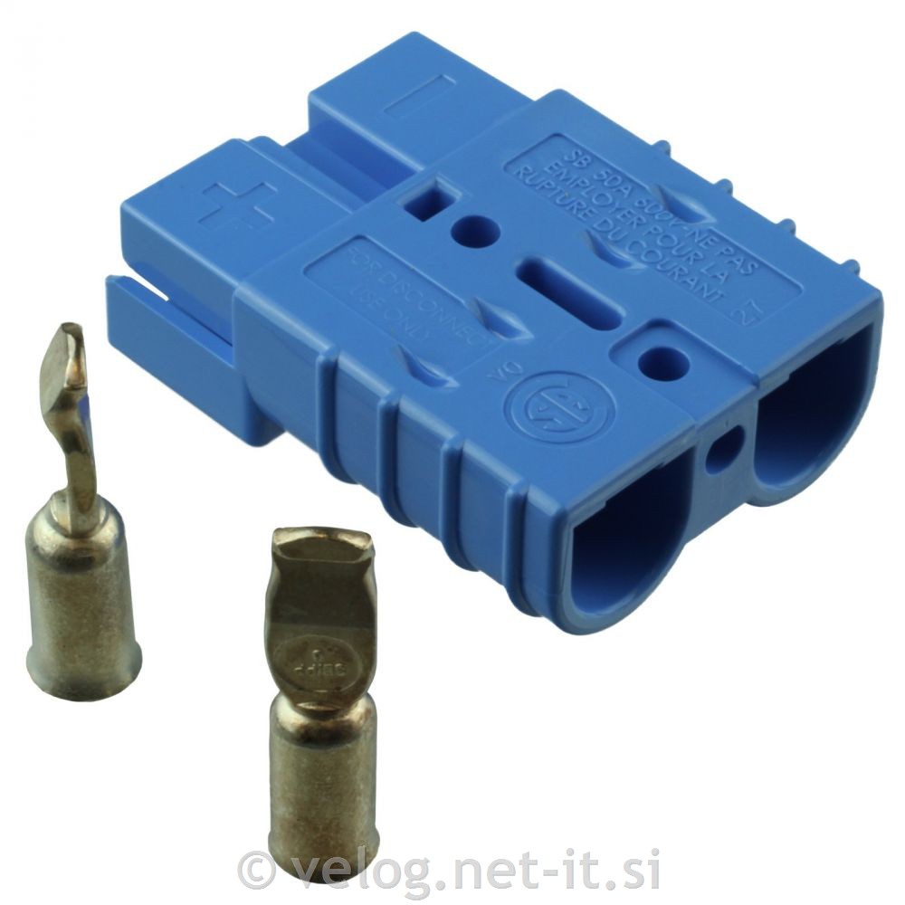 Konektor Anderson SB 50 moder 13,3mm2 s ploščatimi kontakti zagotavlja hitro in enostavno povezavo med baterijo in vozilom oziroma polnilcem.