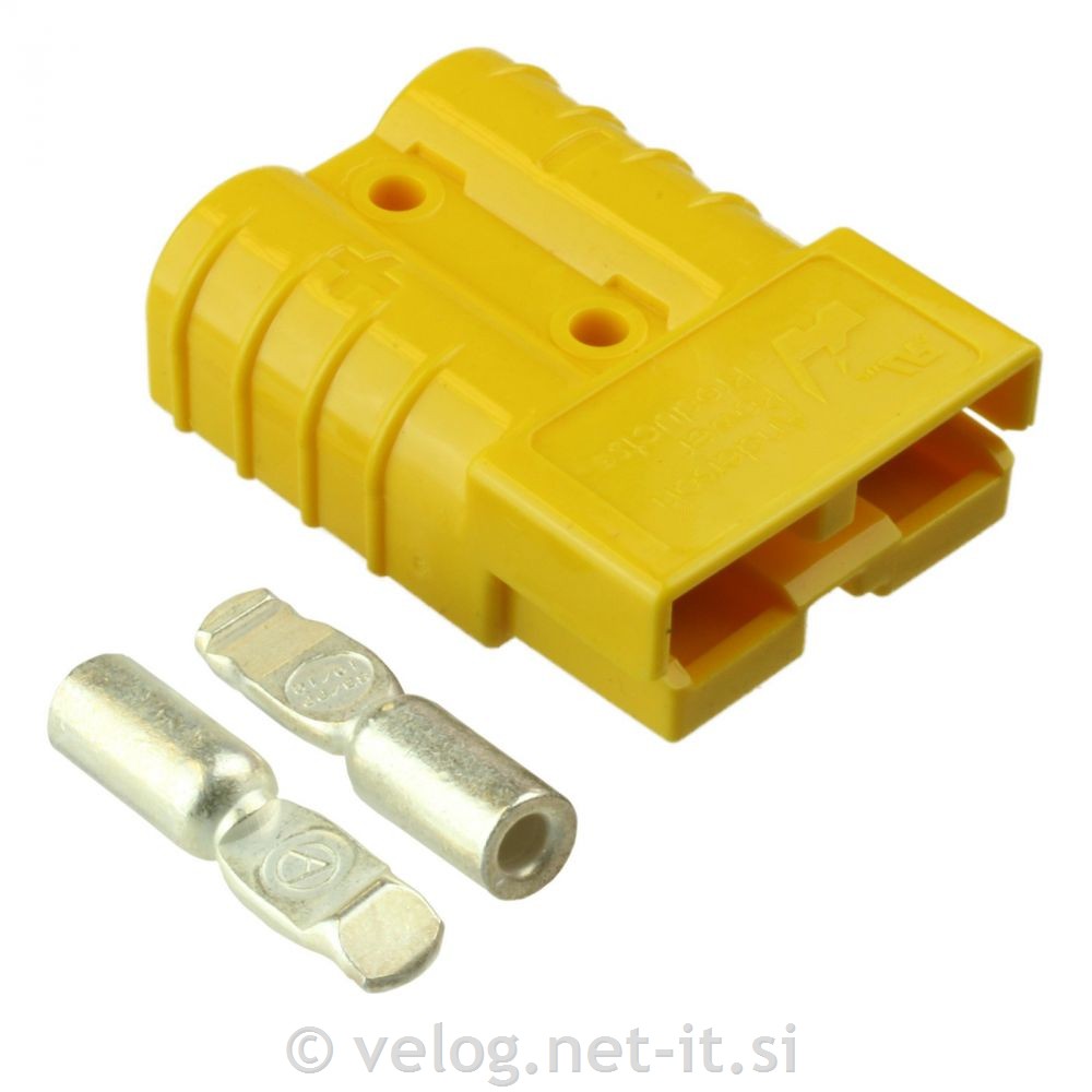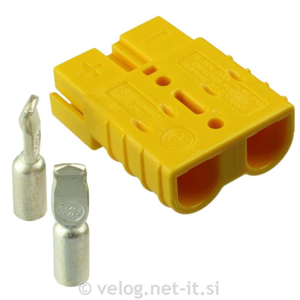 Konektor Anderson SB 50 rumen 5,6mm2 s ploščatimi kontakti zagotavlja hitro in enostavno povezavo med baterijo in vozilom oziroma polnilcem.