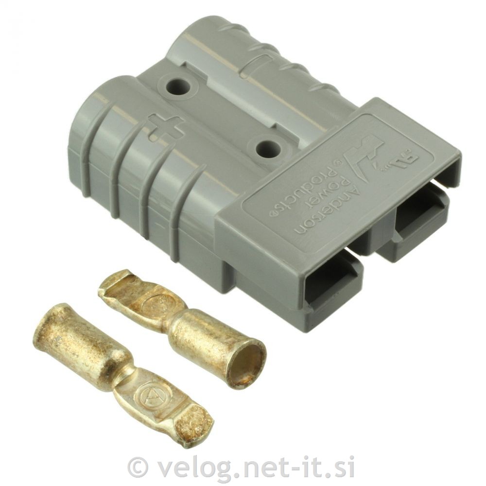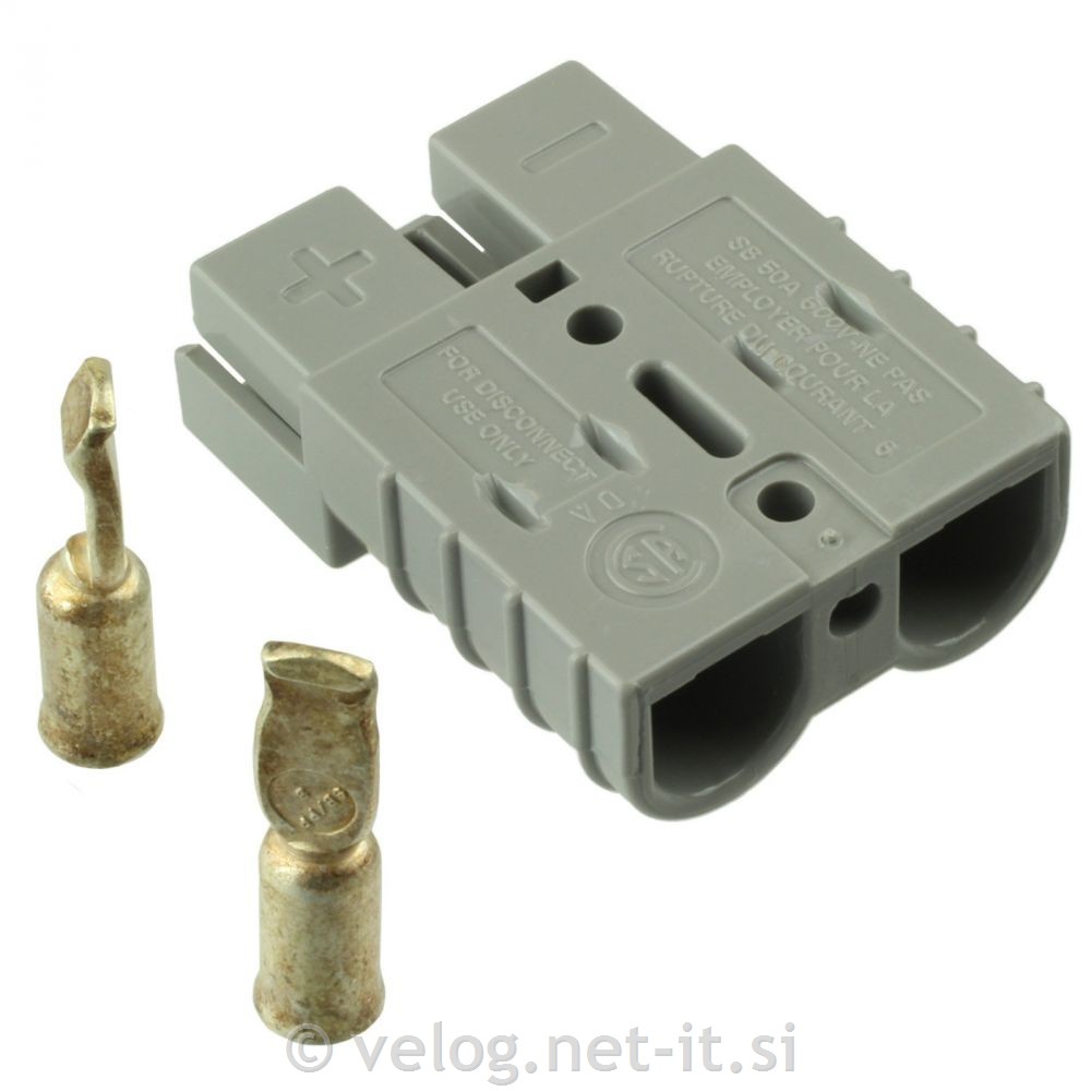 Konektor Anderson SB 50 siv 5,6mm2 s ploščatimi kontakti zagotavlja hitro in enostavno povezavo med baterijo in vozilom oziroma polnilcem.