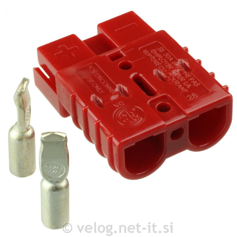 Konektor Anderson SB 350 rdeč 67,4mm2 s ploščatimi kontakti zagotavlja hitro in enostavno povezavo med baterijo in vozilom oziroma polnilcem.