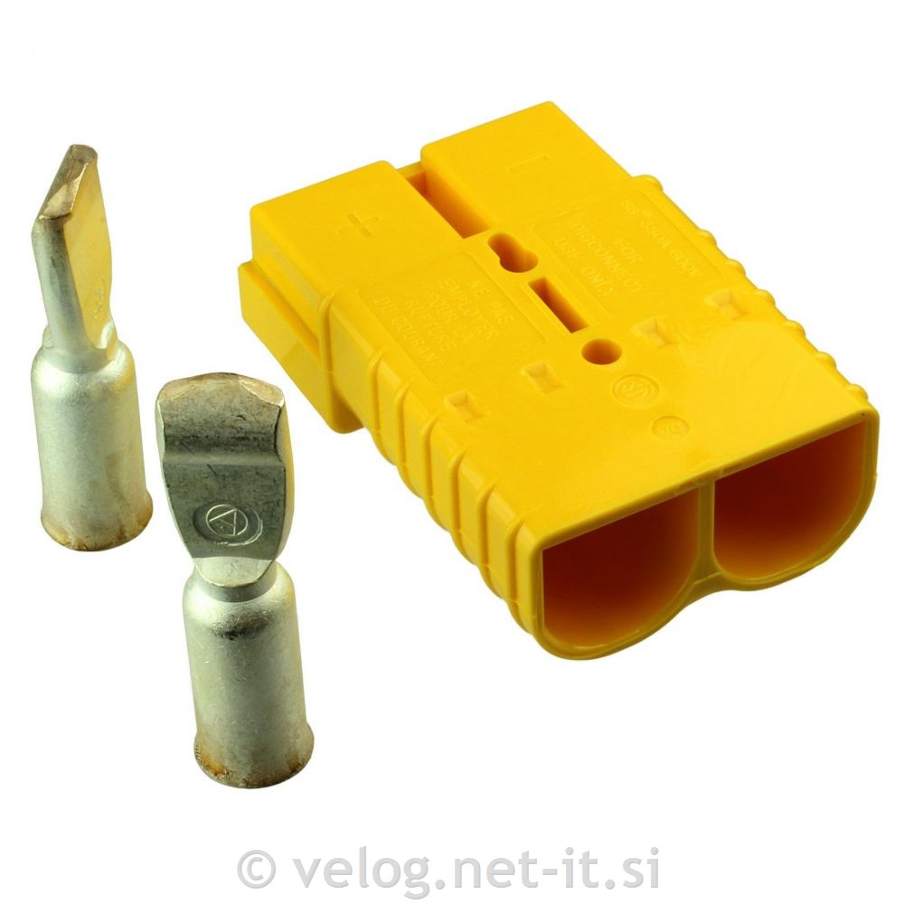 Konektor Anderson SB 350 rumen 107,2mm2 s ploščatimi kontakti zagotavlja hitro in enostavno povezavo med baterijo in vozilom oziroma polnilcem.
