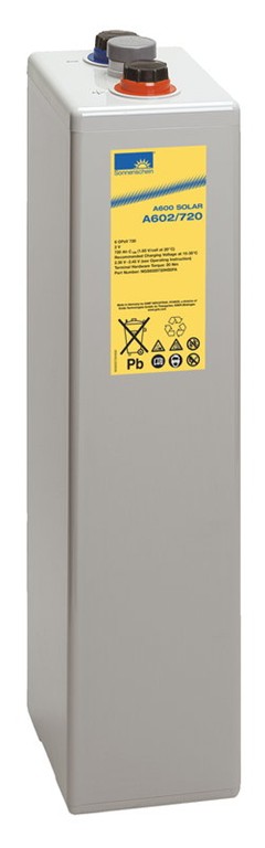 Solarna gel baterija Sonnenschein A602/850 je 2V baterijska celica, ki se povezuje v 12V, 24V in 48V baterijske sklope. Baterija ima izredno dolgo življenjsko dobo, več kot 3.000 ciklov pri 60% praznjenju.