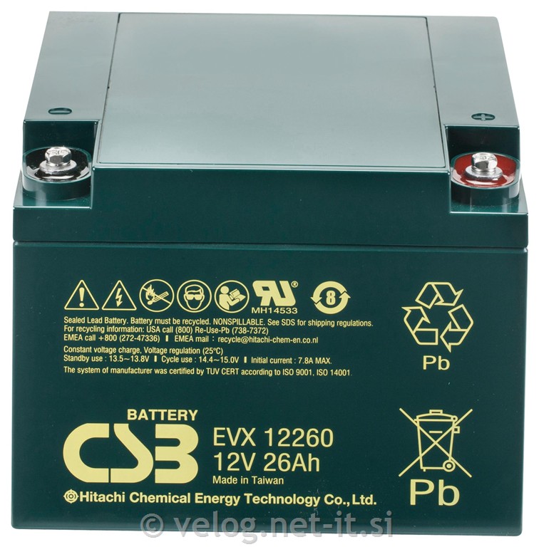 Akumulator CSB Energy EVX12260, 12V, 26Ah ima dolgo življenjsko dobo, saj zdrži več kot 700 ciklov polnjenj in praznjenj pri vsakokratnem 50% praznjenju.