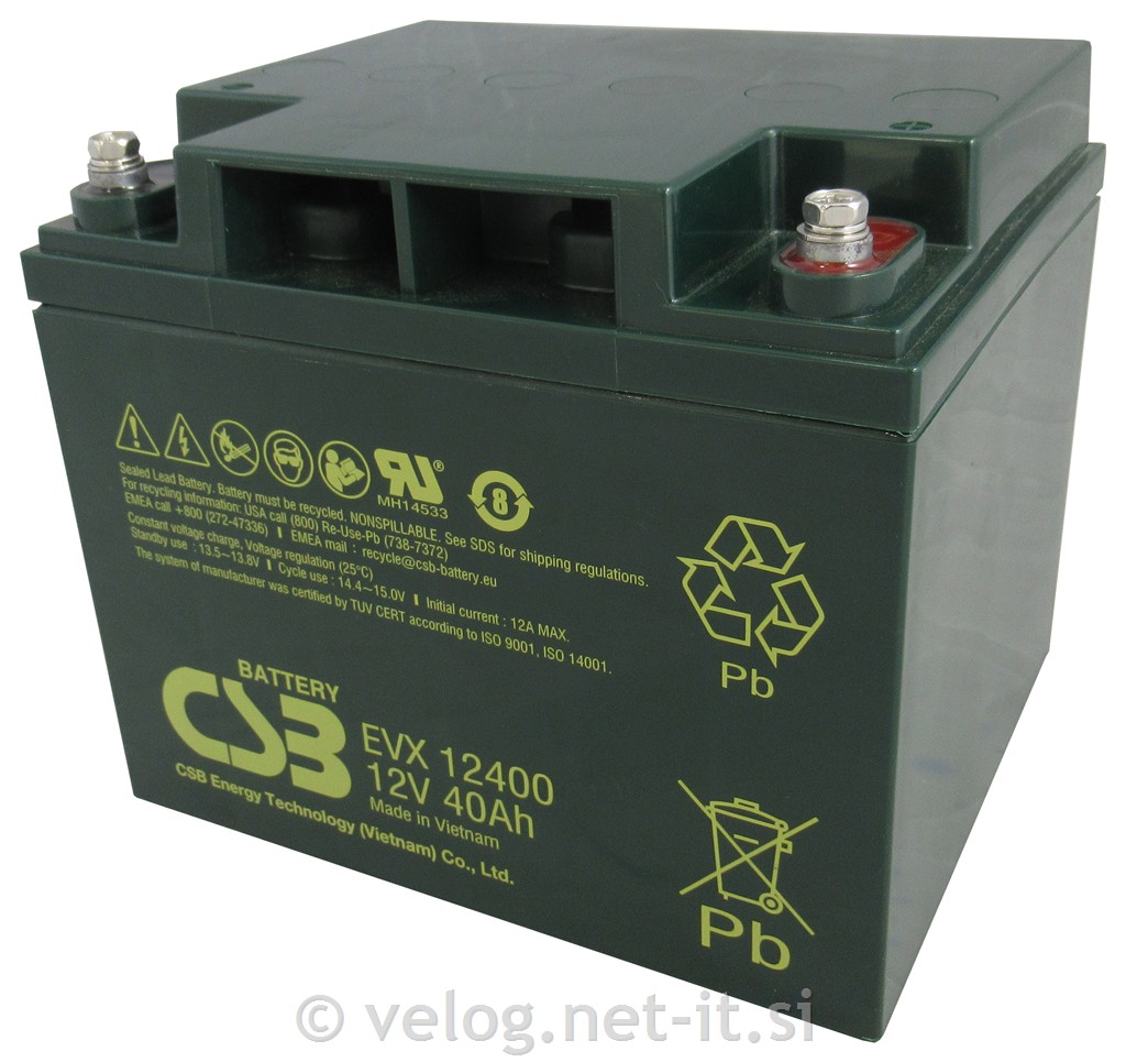 Ciklični akumulator AGM CSB Energy, 12V 40Ah, je namenjen večkratnim globokim praznitvam. Primeren je zlasti za invalidske vozičke in skuterje, ter manjše solarne sisteme. Akumulator CSB Energy EVX12400, 12V, 40Ah ima dolgo življenjsko dobo, saj zdrži več kot 700 ciklov polnjenj in praznjenj pri vsakokratnem 50% praznjenju. Narejen je v AGM tehnologiji, zato nudi vrsto prednosti. Je zaprt akumulator, izpusta plinov tudi pri polnjenju ni, kar pomeni, da je mogoče akumulator varno namestiti tudi v zaprte prostore. Izliv elektrolita ni možen in ga je možno vgraditi tudi v vodoravnem/bočnem položaju. Zaradi nizke notranje upornosti so izgube vsaj za 10% manjše, kot pri klasičnih akumulatorjih. Električno polnjenje akumulatorja je tudi znatno hitrejše.