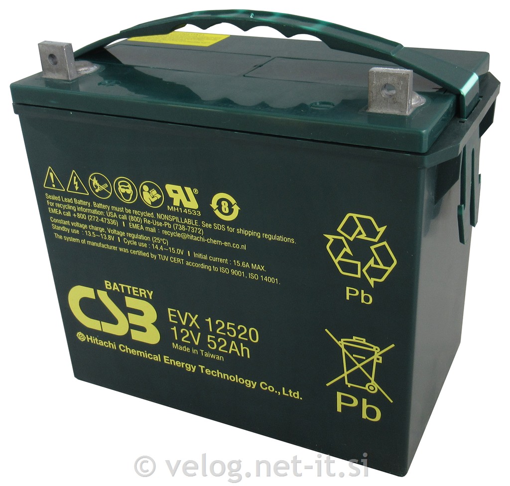 Akumulator CSB EVX12520, 12V, 52Ah ima dolgo življenjsko dobo, saj zdrži več kot 700 ciklov polnjenj in praznjenj pri vsakokratnem 50% praznjenju.