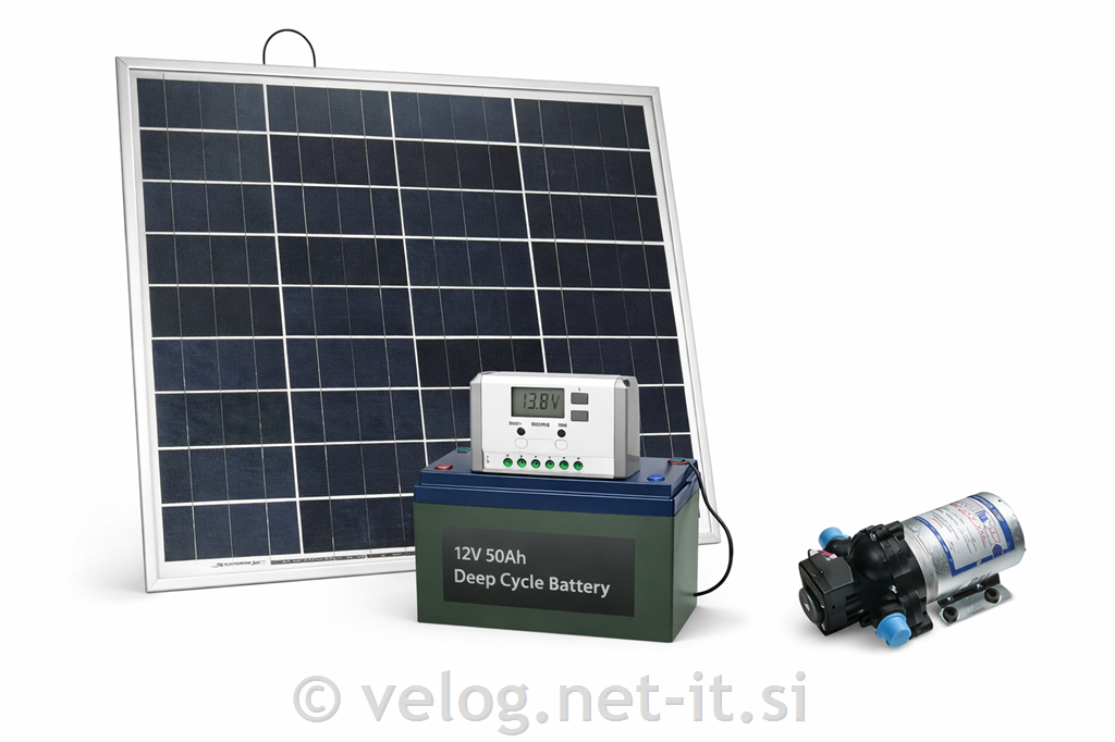 Solarni komplet je sestavljen iz 12V vodne črplake Shurflo in 50W ali 100W solarnega modula. Vodna črpalka prečrpa 10,7 litrov vode na minuto.